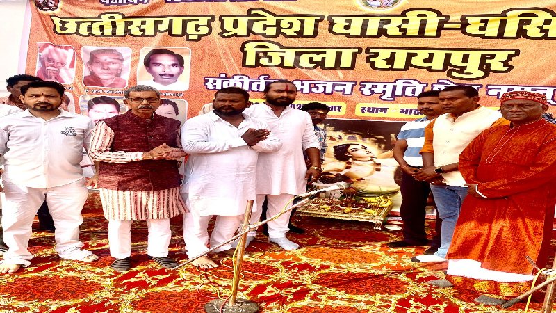 रायपुर। छत्तीसगढ़ प्रदेश घासी घसिया समाज द्वारा राजधानी रायपुर के बीएसयूपी कॉलोनी, भाठागाँव में “संकीर्तन भजन स्मृति शेष नमन कार्यक्रम” का आयोजन किया गया। इस पावन अवसर पर छत्तीसगढ़ और ओड़िशा प्रदेश की अनेक भजन कीर्तन मंडलियों ने शानदार प्रस्तुति देकर पूरे वातावरण को भक्तिमय बना दिया। इस दौरान लोग भजन-कीर्तन की मधुर तान पर झूमते नजर आए।