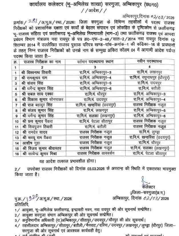Transfer News : तहसील कार्यालयों में पदस्थ अफसरों के बडी संख्या में तबादले हुए हैं। राजस्व निरीक्षकों के तबादले हुए हैं। देखिये पूरी लिस्ट..