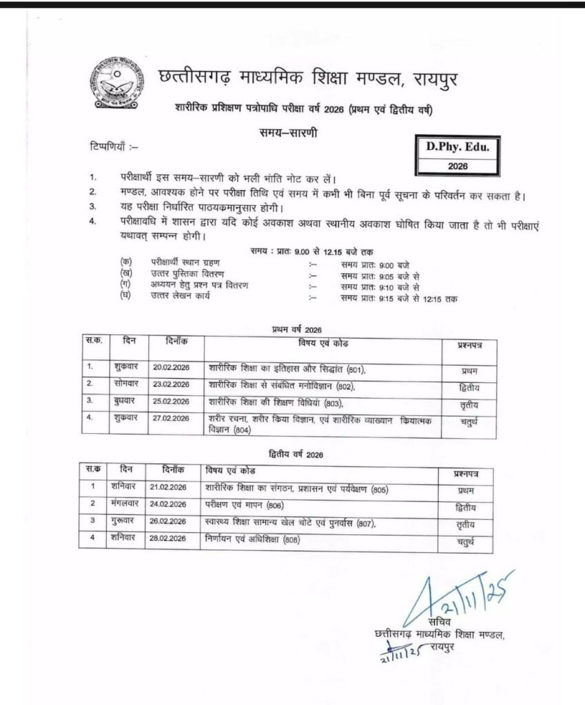 छत्तीसगढ़ बोर्ड ऑफ सेकेंडरी एजुकेशन (CGBSE) ने 10वीं और 12वीं की बोर्ड परीक्षा 2025-26 का टाइम टेबल जारी कर दिया है। दसवीं की परीक्षा 21 फरवरी 2026 से शुरू होगी, जबकि बारहवीं की परीक्षा 20 फरवरी 2026 से आयोजित की जाएगी।