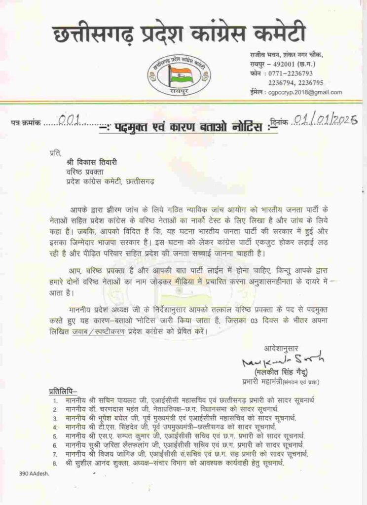 प्रदेश कांग्रेस अध्यक्ष के निर्देश पर विकास तिवारी को कारण बताओ नोटिस जारी किया गया है। उन्हें 3 दिनों के भीतर अपना लिखित स्पष्टीकरण देने को कहा गया है। पार्टी सूत्रों का कहना है कि झीरम घाटी कांड छत्तीसगढ़ कांग्रेस के लिए एक भावनात्मक और गंभीर मुद्दा है, जिस पर व्यक्तिगत टिप्पणी स्वीकार्य नहीं है।