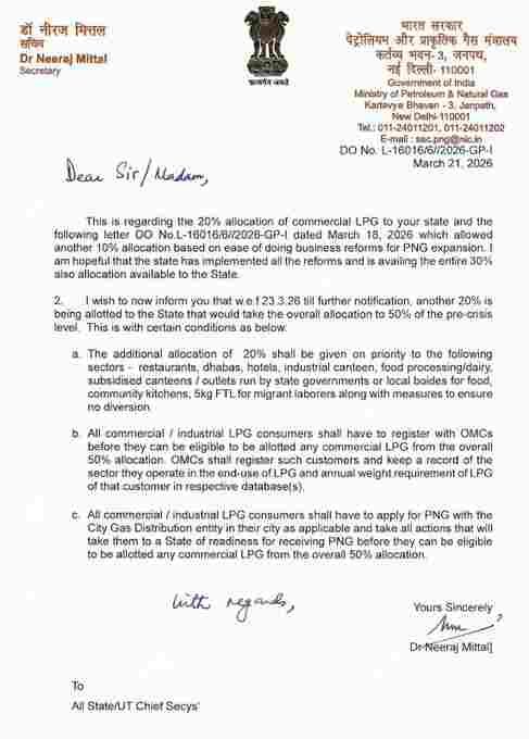 इस नई घोषणा के संदर्भ को समझना भी जरूरी है. गैस संकट के दौरान राज्यों को कमर्शियल एलपीजी का केवल 20 प्रतिशत हिस्सा ही आवंटित किया जा रहा था. इसके बाद 18 मार्च 2026 को जारी एक आदेश में, पीएनजी (PNG) विस्तार के लिए ईज ऑफ डूइंग बिजनेस सुधारों को लागू करने वाले राज्यों को 10 प्रतिशत का अतिरिक्त कोटा दिया गया. सरकार को उम्मीद है कि राज्यों ने इन सुधारों को अपना लिया है और वे 30 प्रतिशत गैस का लाभ उठा रहे हैं. अब 23 मार्च से 20 प्रतिशत का नया कोटा जुड़ने से कुल आपूर्ति पुराने स्तर के 50 प्रतिशत तक पहुंच जाएगी, जिससे बाजार में व्यावसायिक गैस की किल्लत काफी हद तक कम होने की उम्मीद है.