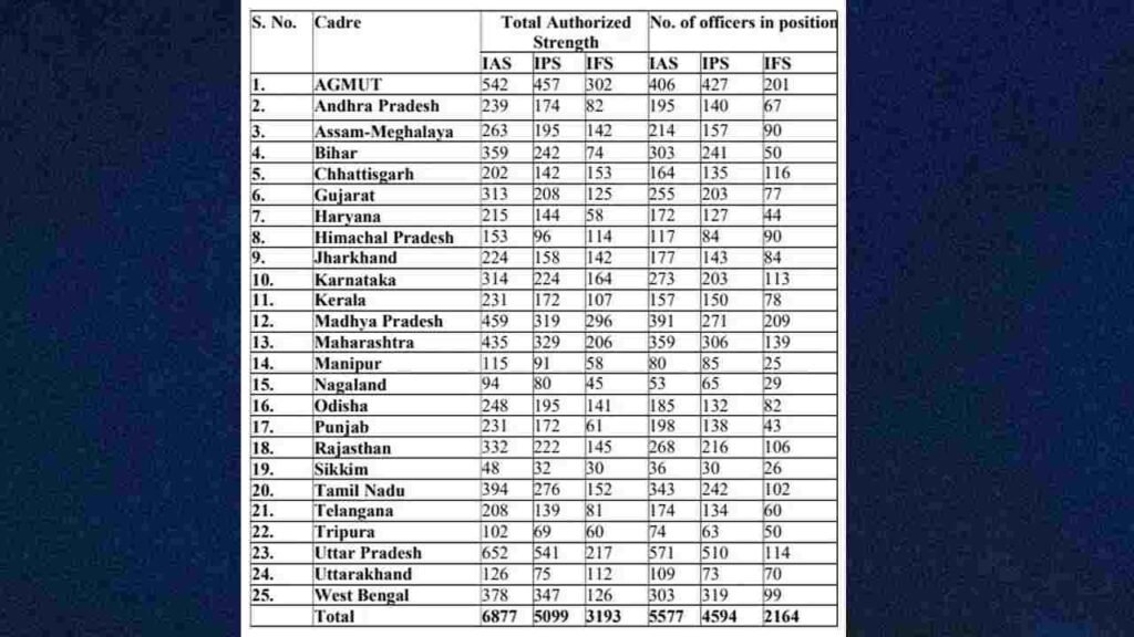 IAS में 6,877 मंजूर पदों के मुकाबले 1,300 अधिकारियों की कमी है. IPS में 5,099 पदों के मुकाबले 505 अधिकारियों की कमी है. IFS में 3,193 मंज़ूर पदों के मुकाबले 1,029 अधिकारियों की कमी है.