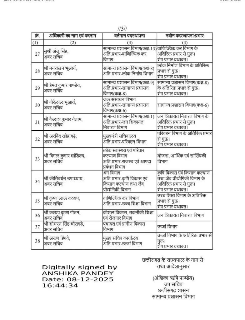 Transfer News: छत्तीसगढ़ में एक बार फिर बड़ा प्रशासनिक फेरबदल हुआ है। राज्य सरकार ने राज्य प्रशासनिक सेवा के एक साथ अधिकारियों का एक साथ तबादला किया है। इस संबंध में सामान्य प्रशासन विभाग ने आदेश जारी किया है। जारी आदेश में कुल 38 अधिकारियों का नाम शामिल है।