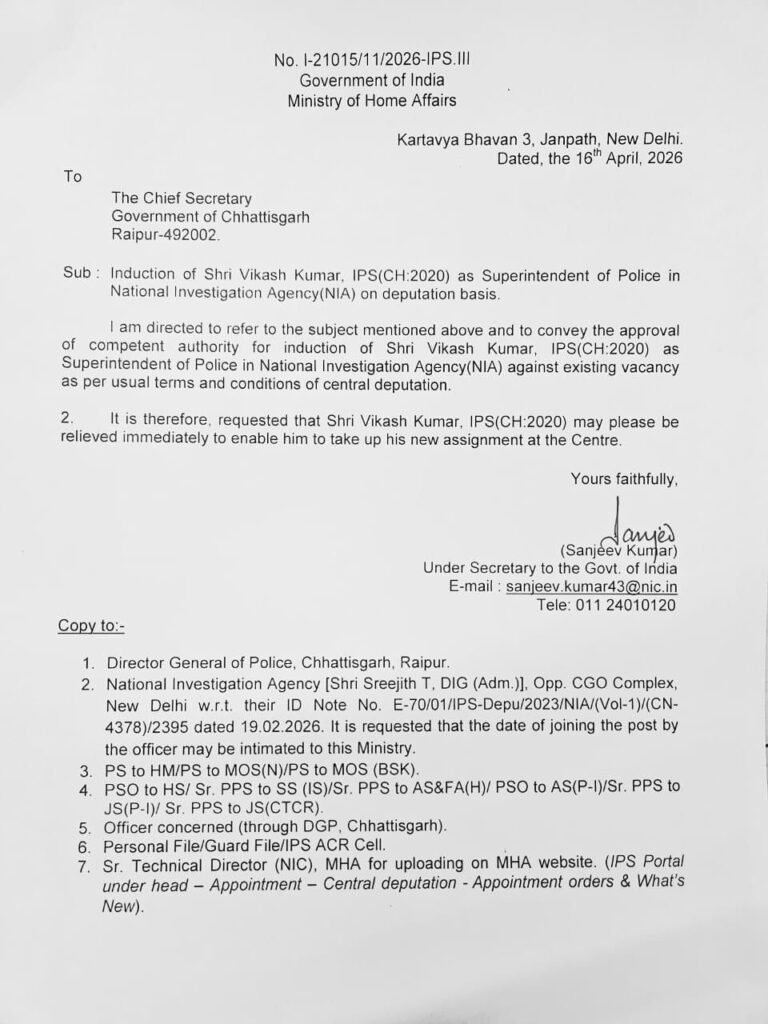 रायपुर: छत्तीसगढ़ कैडर के युवा आईपीएस अधिकारी विकास कुमार को राष्ट्रीय स्तर पर बड़ी जिम्मेदारी सौंपी गई है। उन्हें केंद्रीय प्रतिनियुक्ति पर राष्ट्रीय जांच एजेंसी (NIA) में पदस्थ किया गया है।