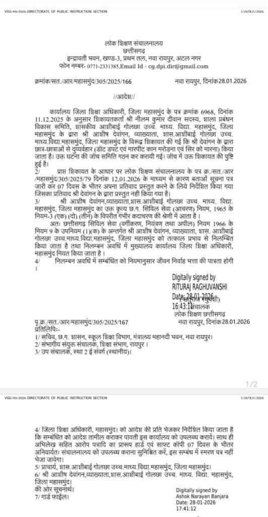 महासमुंद। शासकीय आशीबाई गोलछा उच्च माध्यमिक विद्यालय, महासमुंद के व्याख्याता आशीष देवागन को निलंबित कर दिया गया है। यह कार्रवाई लोक शिक्षण संचालनालय, छत्तीसगढ़ द्वारा की गई है।