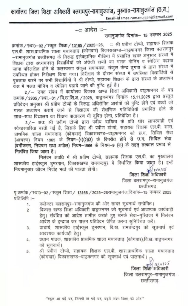 जानकारी के मुताबिक टीचर का नाम प्रवीण टोप्पो है, जो कोगवार प्राइमरी स्कूल में सहायक शिक्षक एलबी के पद पर पोस्टेड हैं.ये सिर्फ तीन गलत शब्द नहीं हैं। ये उन बच्चों की नींव में पड़ी तीन बड़ी दरारें हैं, जिन पर उनका पूरा भविष्य खड़ा होना है। इस वीडियो के वायरल होते ही प्रशासन हरकत में आया। DEO ने शिक्षक प्रवीण टोप्पो को नोटिस जारी कर निलंबित कर दिया है। लेकिन सवाल सिर्फ कार्रवाई का नहीं। इन मासूमों का हक सिर्फ स्कूल नहीं। सही शिक्षा है।